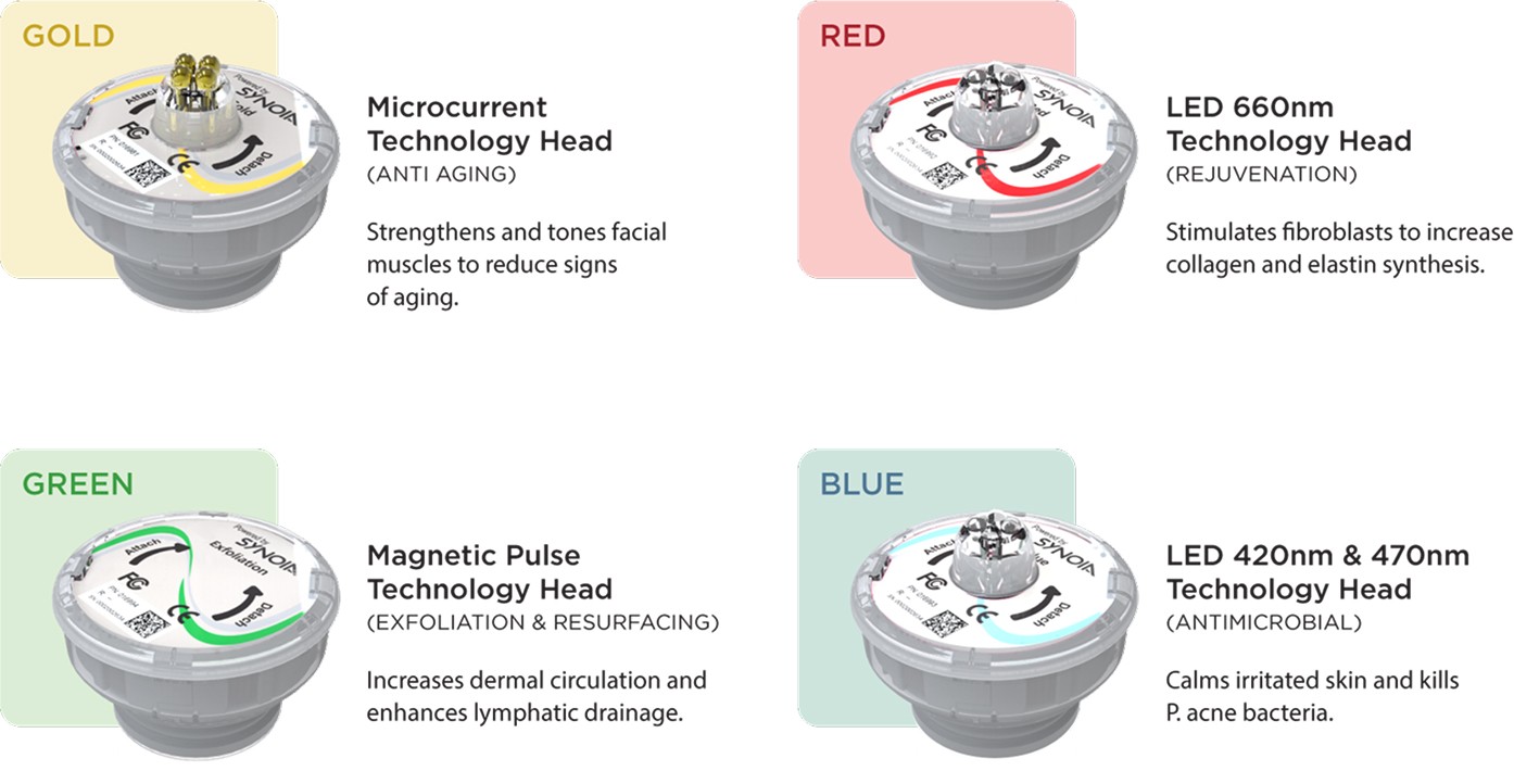 This magnetic field is partially converted to Microcurrent, Red LED, Blue LED or Magnetic Pulse technologies using the dierent technology heads and in tandem with the serum-infused treatment capsules, MIT enables deeper penetration of the active serums into the skin.